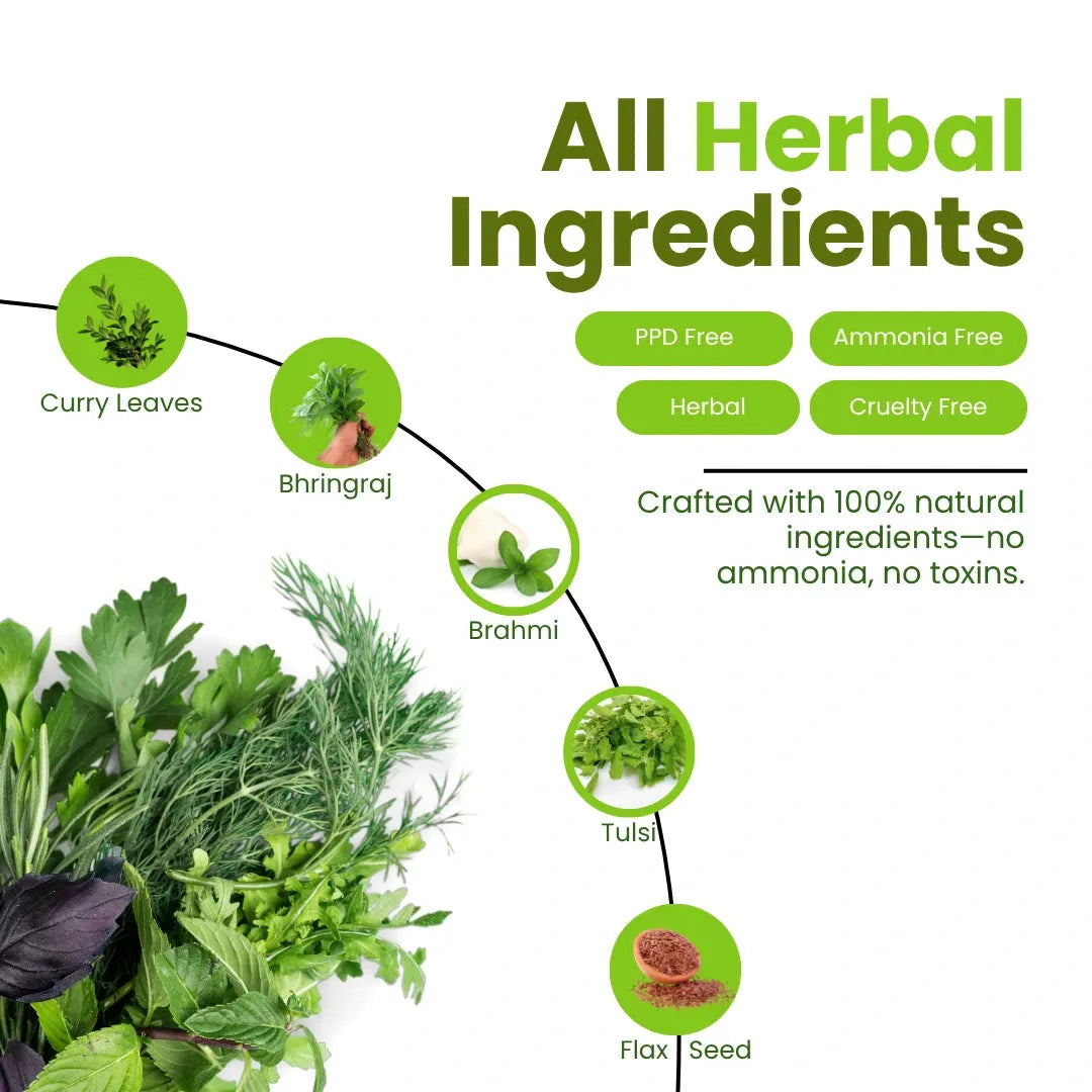 - Bhringraj, Tulsi, Amla, Curry Leaves, Jaborandi, Brahmi, Indonesian Herbs Sage, Fenugreek, Flax Seeds, Malaysian Fleece Flower