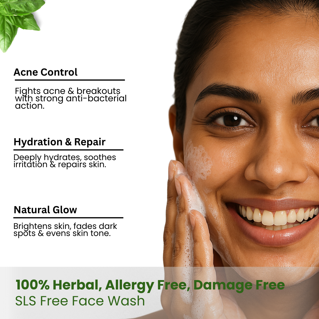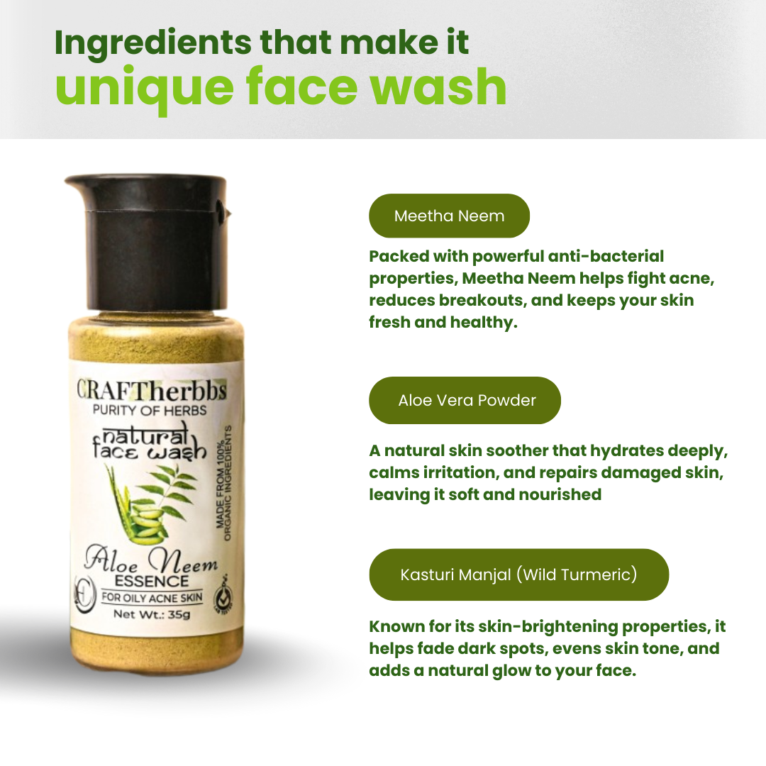 Craftherbbs Herbal Neem Face Wash is a 100% natural cleanser designed to deeply purify and refresh your skin. Enriched with the goodness of neem and other organic ingredients, it effectively removes dirt, oil, and impurities, leaving your skin clear and glowing. This chemical-free face wash helps combat acne, reduces blemishes, and soothes irritated skin, making it perfect for all skin types, including sensitive skin. Free from parabens and harsh chemicals, it ensures a gentle yet powerful cleansing experience. Revitalize your skincare routine with Craftherbbs Neem Face Wash and embrace naturally healthy, radiant skin.