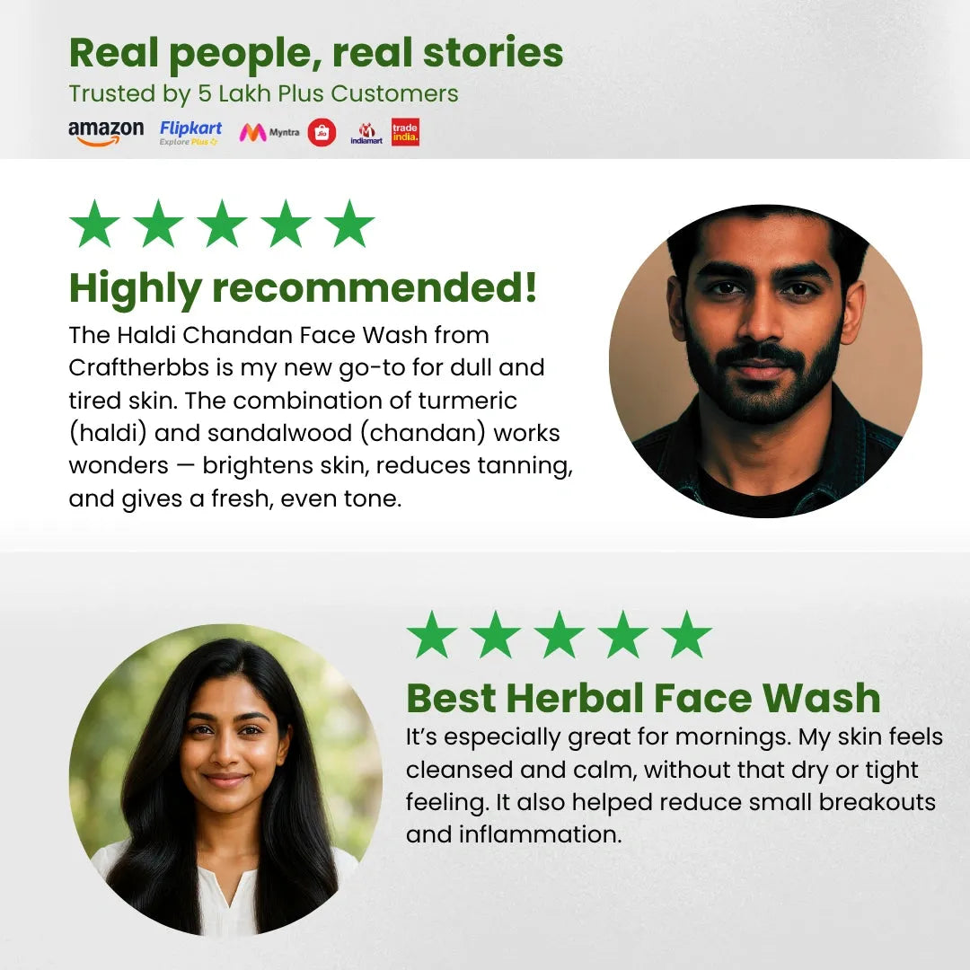 Craftherbbs Herbal Haldi Chandan Blend Face Wash is a 100% natural cleanser enriched with the goodness of turmeric (haldi) and sandalwood (chandan). This powerful combination helps to brighten the skin, reduce blemishes, and provide a soothing, refreshing cleanse. Perfect for all skin types, this paraben-free and chemical-free formula gently removes impurities while promoting a healthy, radiant complexion. Experience the magic of ancient herbal remedies with every wash. Choose Craftherbbs Haldi Chandan Blend Face Wash for glowing, nourished, and naturally beautiful skin.
